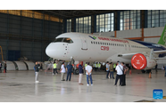 This photo taken on March 10, 2024 shows a Chinese airplane C919 developed by the Commercial Aircraft Corporation of China, Ltd. (COMAC) during a static display at Soekarno-Hatta International Airport in Jakarta, Indo...