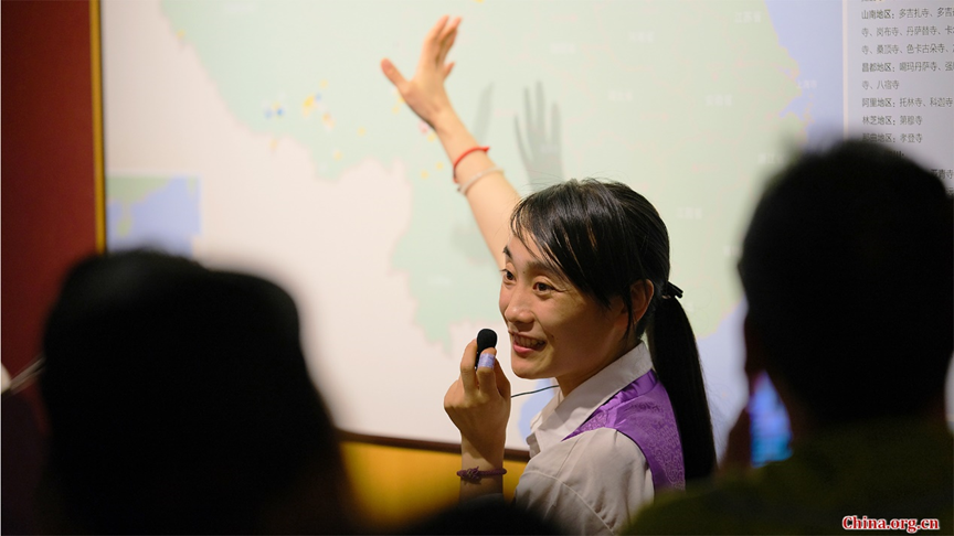 A guide answers visitors' questions at the Museum of Tibetan Culture in Beijing, Sept. 3, 2024. [Photo by Fu Junhua/China.org.cn]