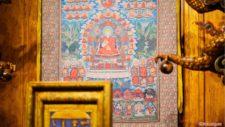 A hanging painting of a Buddha on display in the Museum of Tibetan Culture in Beijing, Sept. 3, 2024. [Photo by Fu Junhua/China.org.cn]