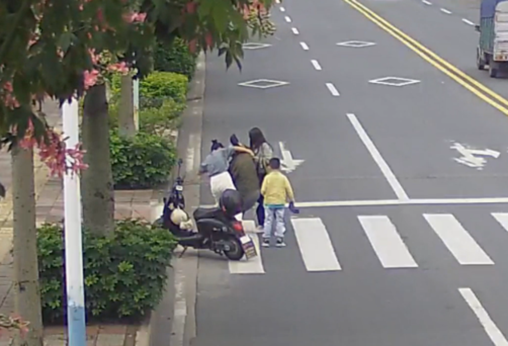 In surveillance footage, an elderly man suddenly fell on a zebra crossing while crossing the road. A young woman riding an electric bike with a child saw this, without hesitation, quickly turned around, approached the elderly man, got off the bike to check on him, and helped him up. Meanwhile, the child thoughtfully picked up the elderly man's fallen hat and dusted off the dirt on it...