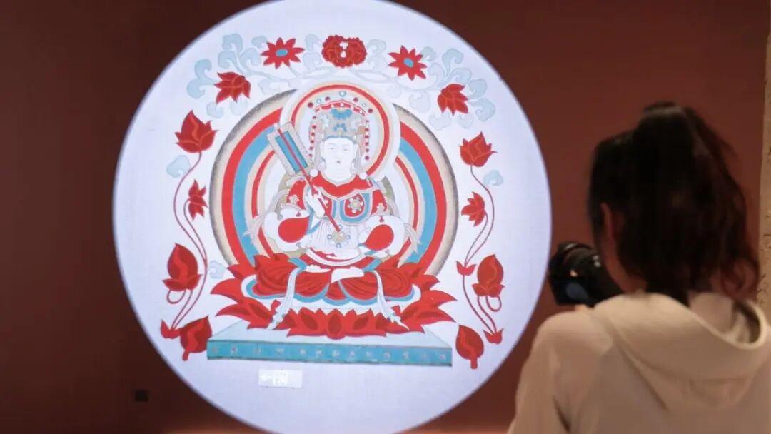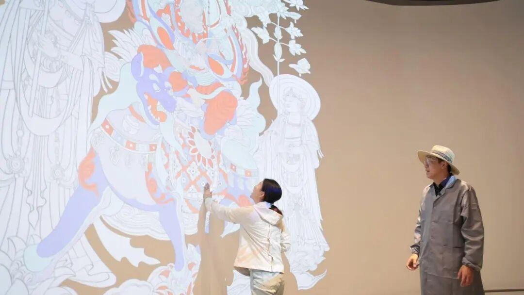 为了让文物“活”起来,展区还设置了互动区,数字飞屏将珍稀图像“送上天幕”,游客可通过手势为线稿上色,体验科技与传统的融合。