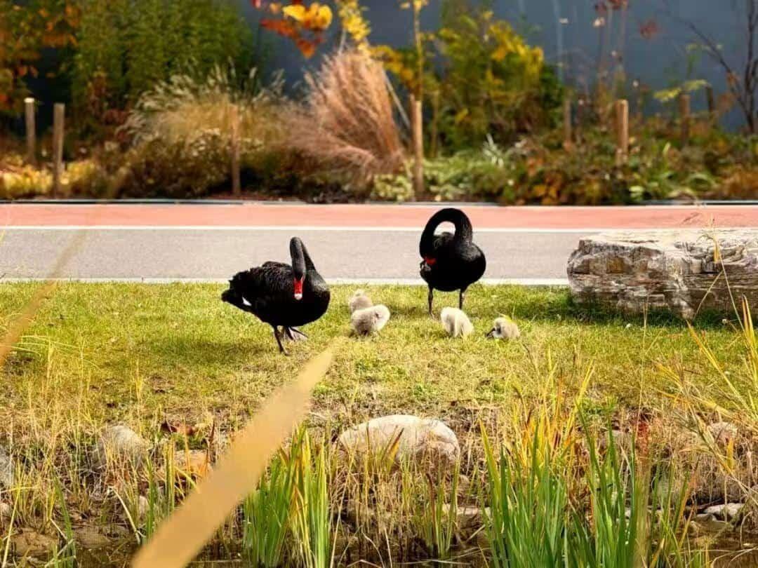 而在不远处的湖心岛及草坪区域,早前的两个黑天鹅家庭已开始带着宝宝们“遛弯”了。这两组家庭此前共成功孵化出6只小黑天鹅。在父母的精心照料下,小家伙们如今已能跟随爸妈在湖中游弋、于草丛觅食。它们灰茸茸的稚拙模样,仿佛童话中走出的“丑小鸭”,成为这个初冬植物园中最温暖的生命画卷。