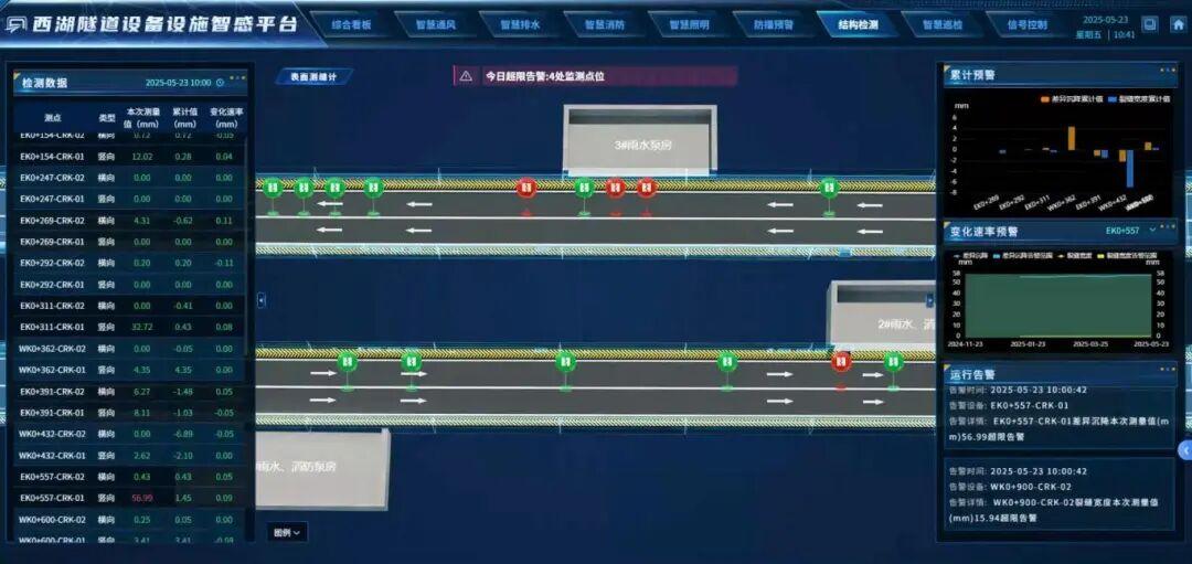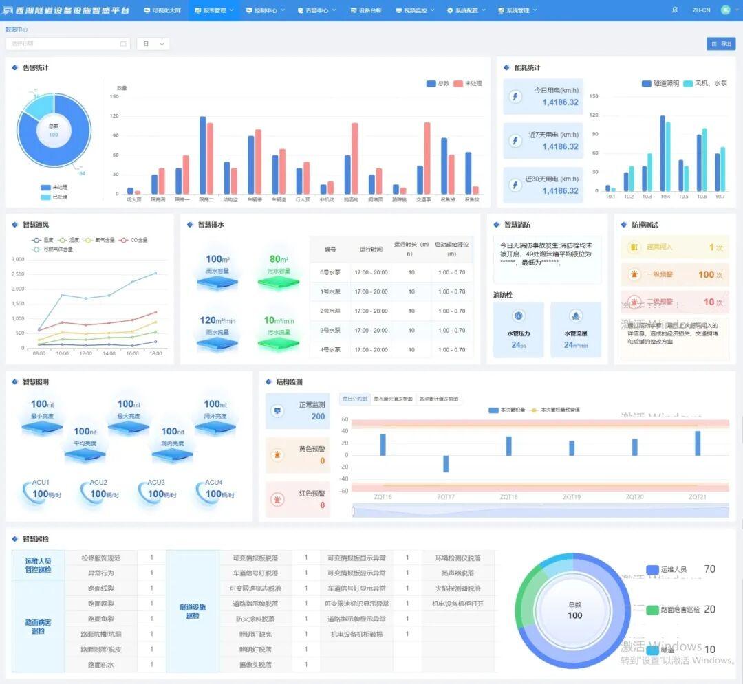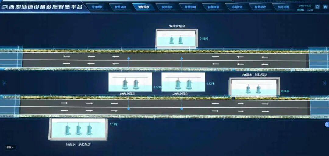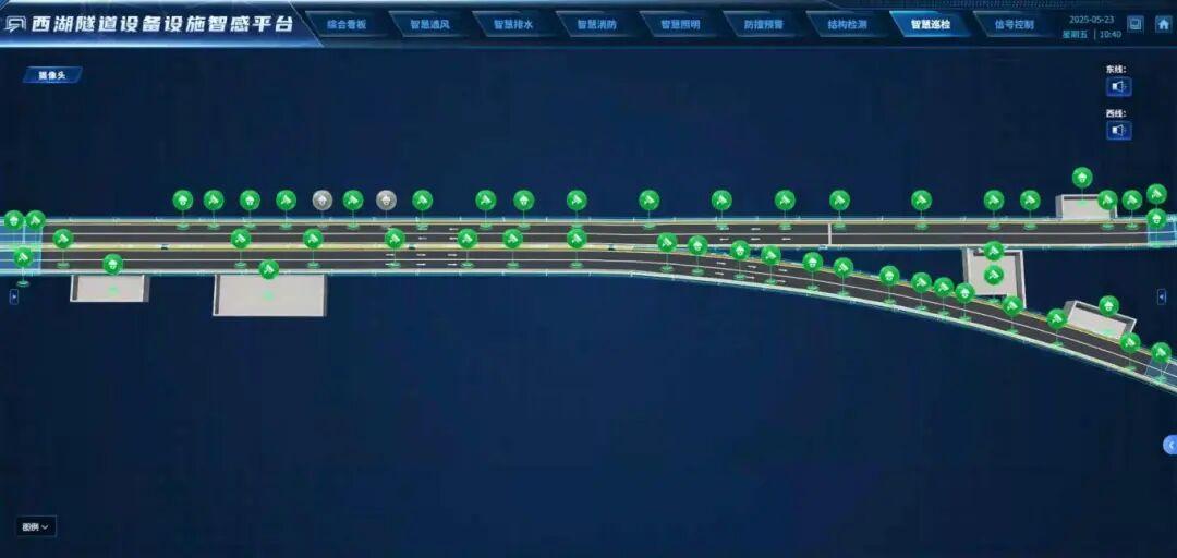 新平台结合西湖隧道实际需求和现状详情,在“无人值守”的远期愿景引领下,以设备设施全生命周期数据为核心、以数据治理为抓手,全方位掌握隧道排水系统、物联网消防给水系统、防撞预警系统、健康监测系统、智慧巡查系统等各大系统实时运行情况,实现界面可视、数据交互、信息共享、统一整合,助力西湖隧道安全高效运行。