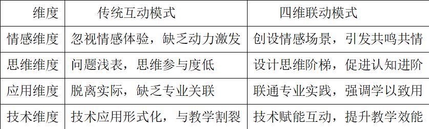 “四维联动”课堂互动模式以培育学生的核心素养,提高互动学习行为的有效性为目标,它从情感共鸣出发,以思维进阶为方向,通过应用迁移落地,借助技术赋能支持的立体互动体系。它像一座桥梁,先以触动人心的情感连接为根基,再引导思考向更深层次发展,同时帮助学生将所学转化为实际能力,最后用技术工具的力量提供支持,让整个互动过程既温暖又富有实效。
