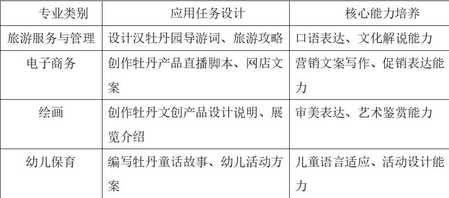 联通专业学习:根据不同的专业特色分设不同难度的应用任务,例如要求旅游服务与管理专业的学生为牡丹园制作一份导游解说方案;要求电子商务专业学生为牡丹相关产品设计一份网络直播带货脚本;要求绘画专业的学生为牡丹文化设计一份文创产品文案;要求幼儿保育专业的学生撰写一份牡丹童话故事和一份幼儿活动方案。