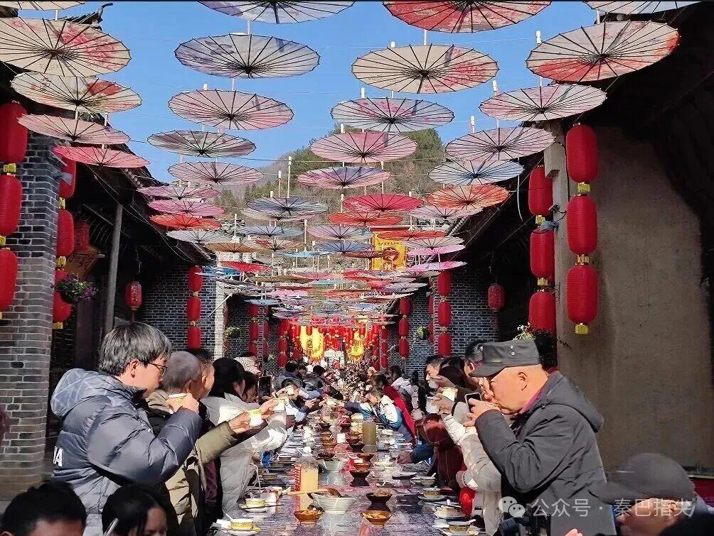 循着香气踏入中坝作坊小镇,人声比风景先一步撞进眼帘。长街之上,长条板凳一字排开,八仙桌拼接成蜿蜒的长龙,天南地北的游客寻味而来,尚未落座,就被说酒礼师傅那一声清亮的吆喝勾了魂:“长条板凳摆四方,东西南北都坐上,今日中坝庖汤会,酒席设在街中央……”吆喝声穿透喧腾的人声,带着山野的粗犷与烟火的温情,瞬间把人拽进陕南独有的热闹里。瓷碗与竹筷碰撞出清脆的节拍,笑声与酒香缠缠绕绕,这方土地的年味,正从柴火灶膛里、从沸腾的汤锅上,汩汩流淌出来。