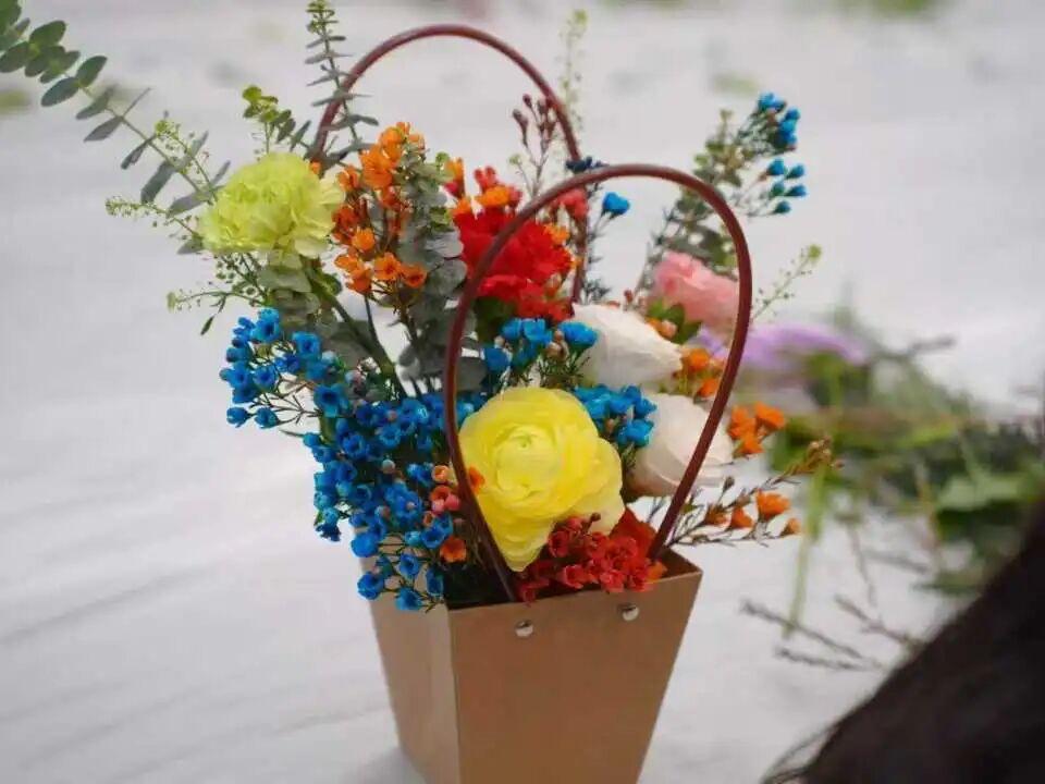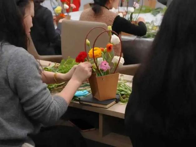 老师示范后,大家早已跃跃欲试,纷纷动手创作属于自己的花艺风景。分组协作间,刚刚学到的知识悄然融入指尖。花艺师轻声走动,适时为大家提供帮助。现场流动着温煦的氛围——有人低头细语,斟酌色彩层次;有人含笑商量,这瓶花该安放于家中何处。盈盈花香中,一双双手精心搭配、耐心调整。渐渐地,一篮篮姿态各异、心意流转的花艺作品,在众人指间温柔绽放。