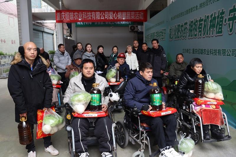 在丰都县三合街道南天湖西路社区的爱心捐赠蔬菜活动现场,贫困户家庭、残疾人朋友以及一些老年群体分别收到米、油以及两家公司自己种植生产的蔬菜捐赠。