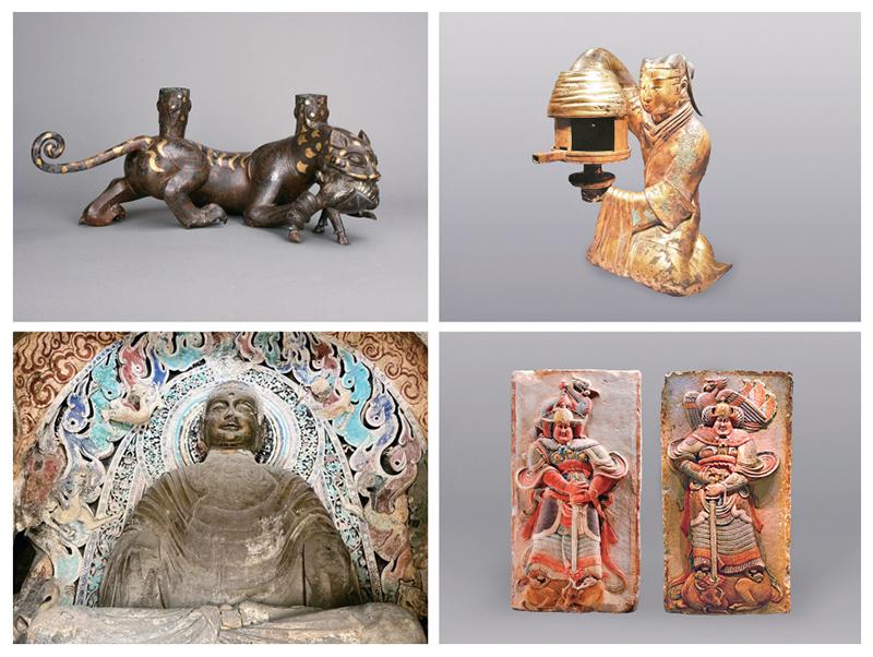 燕赵大地,文脉悠长,如同一面棱镜,折射出中华文明的万千气象。左上图为错金银虎噬鹿铜屏风座,是战国时期用来安装屏风的家具构件;右上图为出土于满城汉墓的长信宫灯,承载着汉代灯具的独特造物美学;左下图为响堂山石窟,是中国北朝石窟雕刻艺术的代表;右下图为王处直墓出土的彩绘浮雕武士石刻,体现了唐末五代时期的精湛技艺。 河北省委宣传部供图