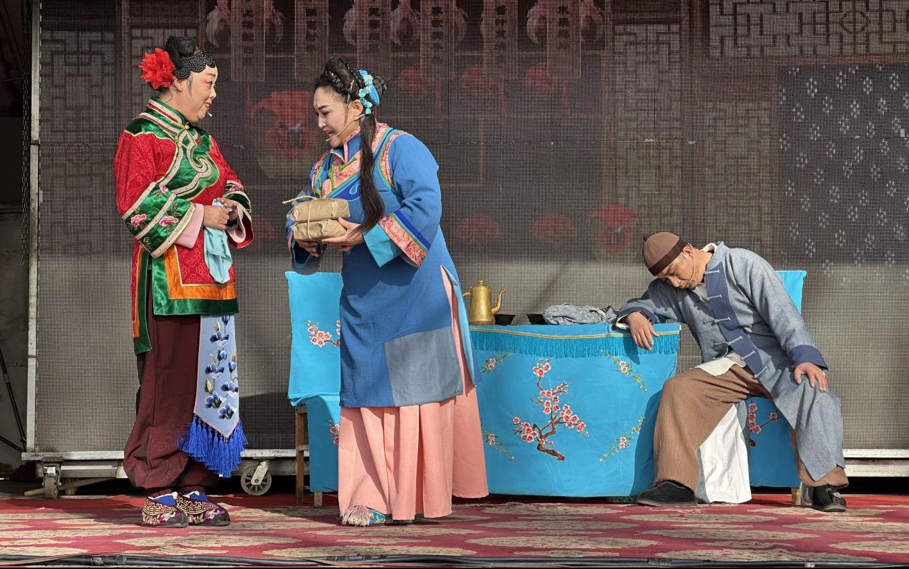 演出现场二人台戏歌《人字歌》婉转悠扬,字正腔圆的唱腔尽显地方戏曲韵味;二人台表演唱《挂红灯》节奏明快、喜庆热烈,演员灵动传神的演绎引得掌声此起彼伏;经典二人台小戏《卖碗》更是将演出氛围推向高潮,一首《春风十万里》清亮开嗓,以诗意的歌词、舒展的旋律勾勒出春和景明的美好画卷;二人台传统小戏《回关南》,演员们扮相鲜活、唱念扎实,乡土气息浓郁的表演让观众沉浸其中;二人台现代小戏《接婆婆》,跌宕的剧情将故事演绎得淋漓尽致。鲜活的剧情、精湛的演技,为现场群众带来一场视听盛宴。
