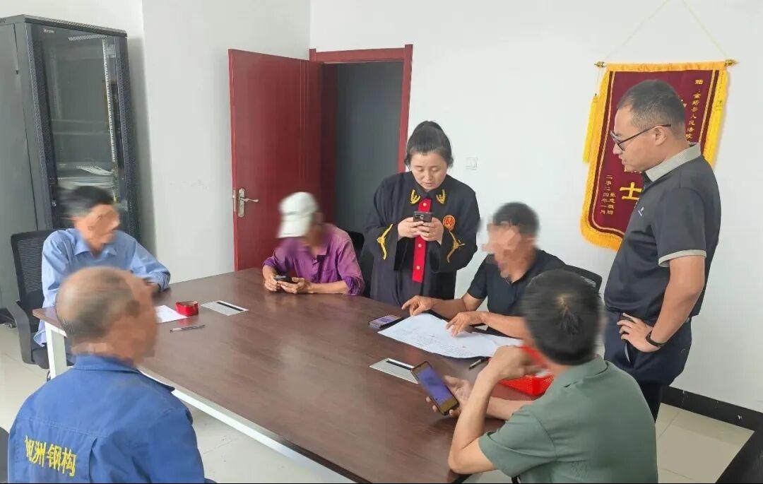 法庭始终立足乡村实际,贴合乡土民情,将“调解前置、全程调解、多元调解”贯穿案件办理全过程,让司法服务更接地气、更暖民心。打破传统办案模式,干警们带着卷宗走进农家院落、深入田间地头,把法庭“搬”到群众家门口,让群众在熟悉的环境中化解纠纷,真切感受到“法庭就在身边,正义触手可及”。在处理一起兄弟间积怨多年的土地纠纷时,法庭并未止步于“案结”的表面成效,而是主动联动村委会、派出所工作人员,实地丈量土地、重新精准划界,创新性引入“六尺巷工作法”,耐心疏导双方情绪、讲解法律规定,最终促使兄弟二人各让0.1亩土地用于修建乡村便道,不仅彻底化解了多年积怨,更修复了濒临破裂的亲情,实现了“案结事了人和”的良好效果。