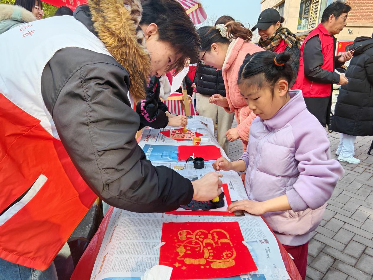 墨香传韵迎新春,挥毫拓印寄温情。活动现场,书法爱好者挥毫泼墨,为居民书写春联和“福”字。红纸铺展、笔走龙蛇,一副副寓意吉祥的春联跃然纸上,社区特别设置的春联晾晒区挂满作品,成为一道喜庆风景线。与此同时,亲子拓印摊位相继亮相,家长与孩子手持拓包与模板,在红纸上轻轻拍打,将生肖、窗花等图案的纹理清晰拓印下来,制成古朴雅致的装饰年画。居民张女士感慨:“和孩子一起拓印、写春联,既触摸了传统技艺的温度,又让亲子时光更有文化味儿,这样的年味才够足!”
