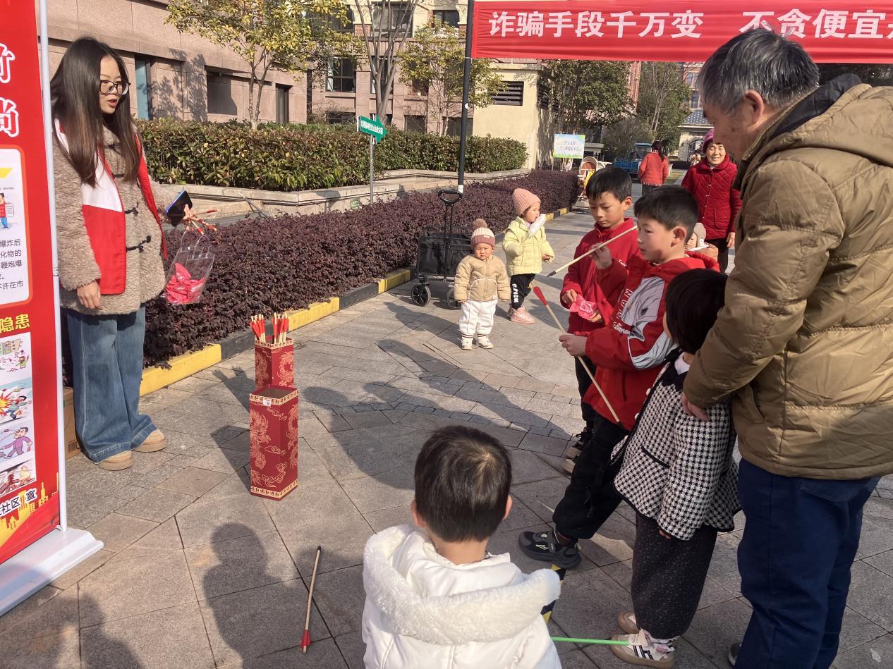 游园趣玩乐翻天,投壶小吃贺团圆。游园区内欢声笑语不断。投壶纳福摊位前,居民手持箭矢瞄准壶口,每一次命中都引来喝彩,寓意新年“投中好运”;新春知识问答区则化身“移动课堂”,居民随机抽取涵盖春节习俗、安全知识的卡片答题,答对即可获得福袋、抽纸等小奖品,在趣味互动中增长知识。此外,居民共创摊位冰糖葫芦与棉花糖的甜香交织弥漫,小朋友们捧着美食嬉戏,大人们则在互动体验中感受年味,进一步拉近邻里距离,为活动增添了欢声笑语。