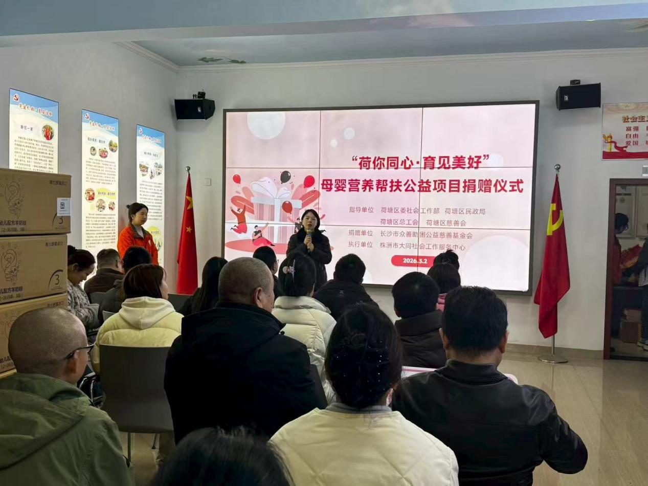 3月2日下午,“荷你同心·育见美好”母婴营养帮扶公益项目捐赠仪式在湖南省株洲市荷塘区公益服务中心一楼大厅圆满举行。本次活动由荷塘区委社会工作部、荷塘区民政局指导,株洲市大同社会工作服务中心具体实施,长沙市众善助困公益慈善基金会倾情捐赠,荷塘区相关部门领导、各街道及社区社工代表、城乡帮困项目负责人等齐聚现场,共同见证爱心传递。