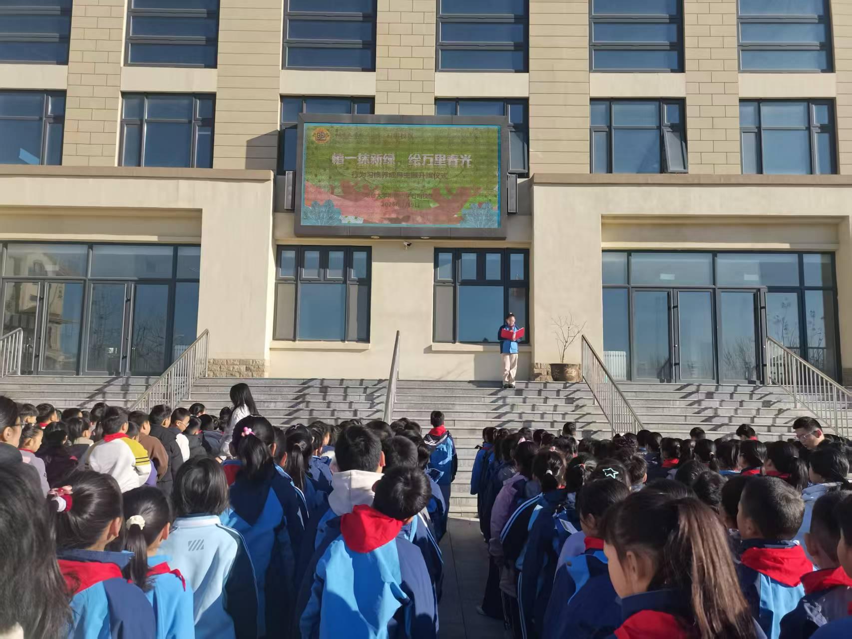 2026年3月9日早晨,烟大附小石明校区全体师生齐聚学校电子大屏幕前,举行升国旗仪式。