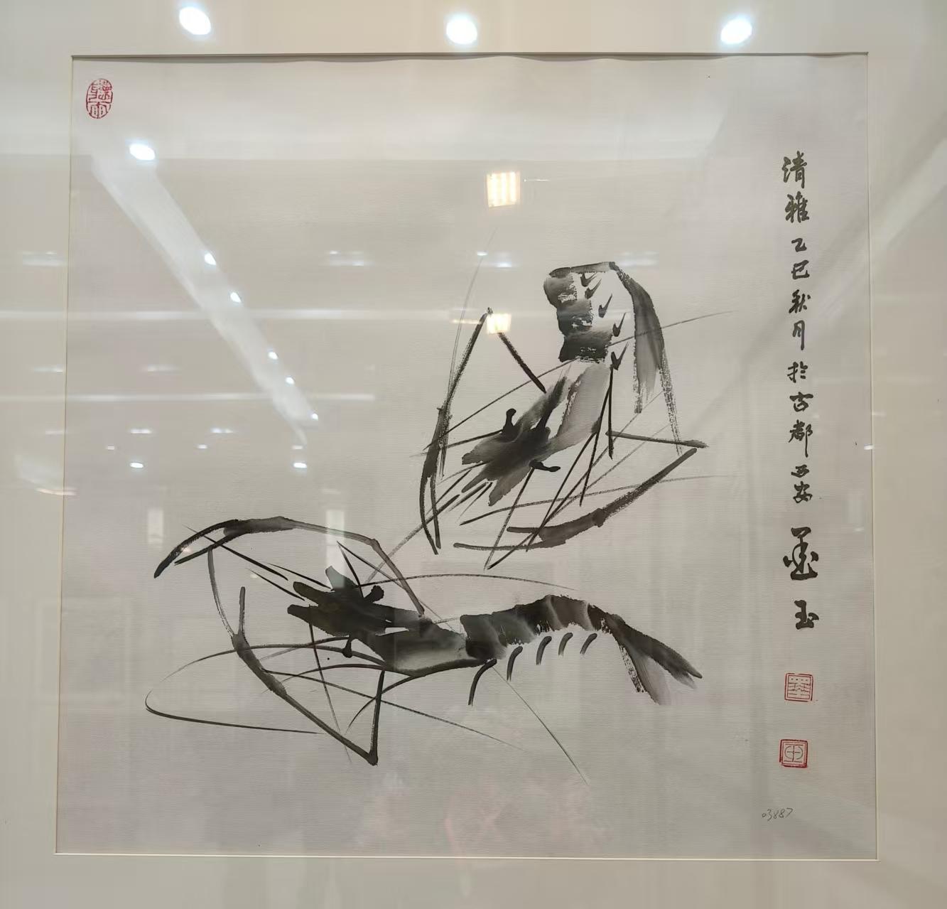 展厅内,国家一级美术师墨玉的水墨虾作品《清雅图》悬挂于醒目位置,成为众人驻足品鉴的焦点。画作中的对虾墨色层次丰富,虾须轻盈飘逸,虾身灵动鲜活,虾钳遒劲有力,尽显“墨分五色”的笔墨精髓,将水中精灵的姿态刻画得栩栩如生。依托齐白石老人奠定的虾画艺术根基,加之“虾”象征吉祥顺遂、步步高升的美好寓意,这幅作品收获了专业评委的高度赞誉、业界同道的一致认可与现场粉丝的热烈青睐。更巧的是,画作对面正是著名画家邓荣明的《美秋光》,图中雄鸡引颈高歌,神采飞扬,与灵动的水墨虾相映成趣,一静一动间构成展厅内极具巧思的视觉韵律及艺术对话,引来观者交口称赞,更为这场银龄书画盛宴增添了别样韵味。