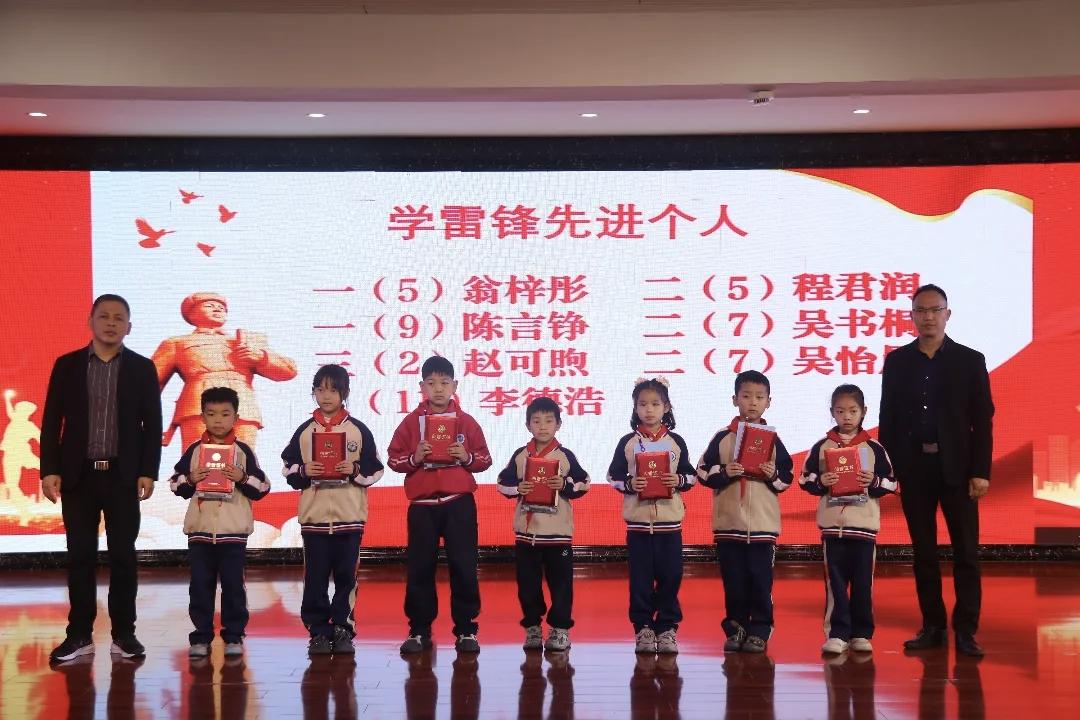 随后进入荣誉时刻。大队辅导员宣读了“雷锋少年”获奖名单,四(1)班官琳等14名学生荣获“雷锋少年”称号。童建华副书记、毛卫峰副校长、赵艳副校长、祝小鹏副校长分两组为获奖学生颁奖。
