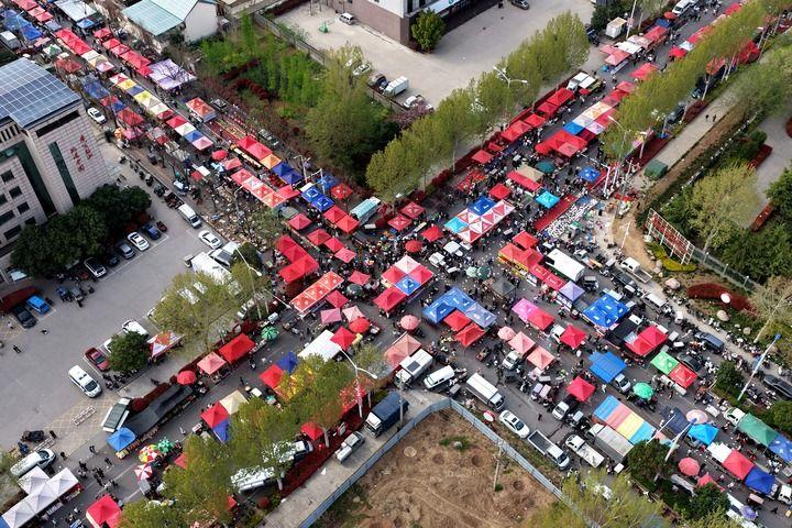 人们在河南省济源市思礼镇清明集市赶集(2026年4月4日摄,无人机照片)。新华社发(段二平 摄)