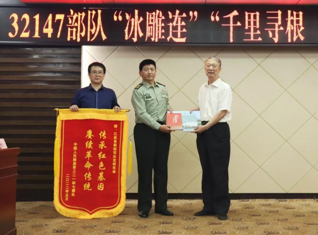 王利飞代表“冰雕连”所在旅党委,将一面锦旗、一封感谢信送到陈坚会长手中,感谢省新四军历史研究会挖掘、整理、弘扬英雄事迹,让尘封的忠魂,重见山河荣光。
