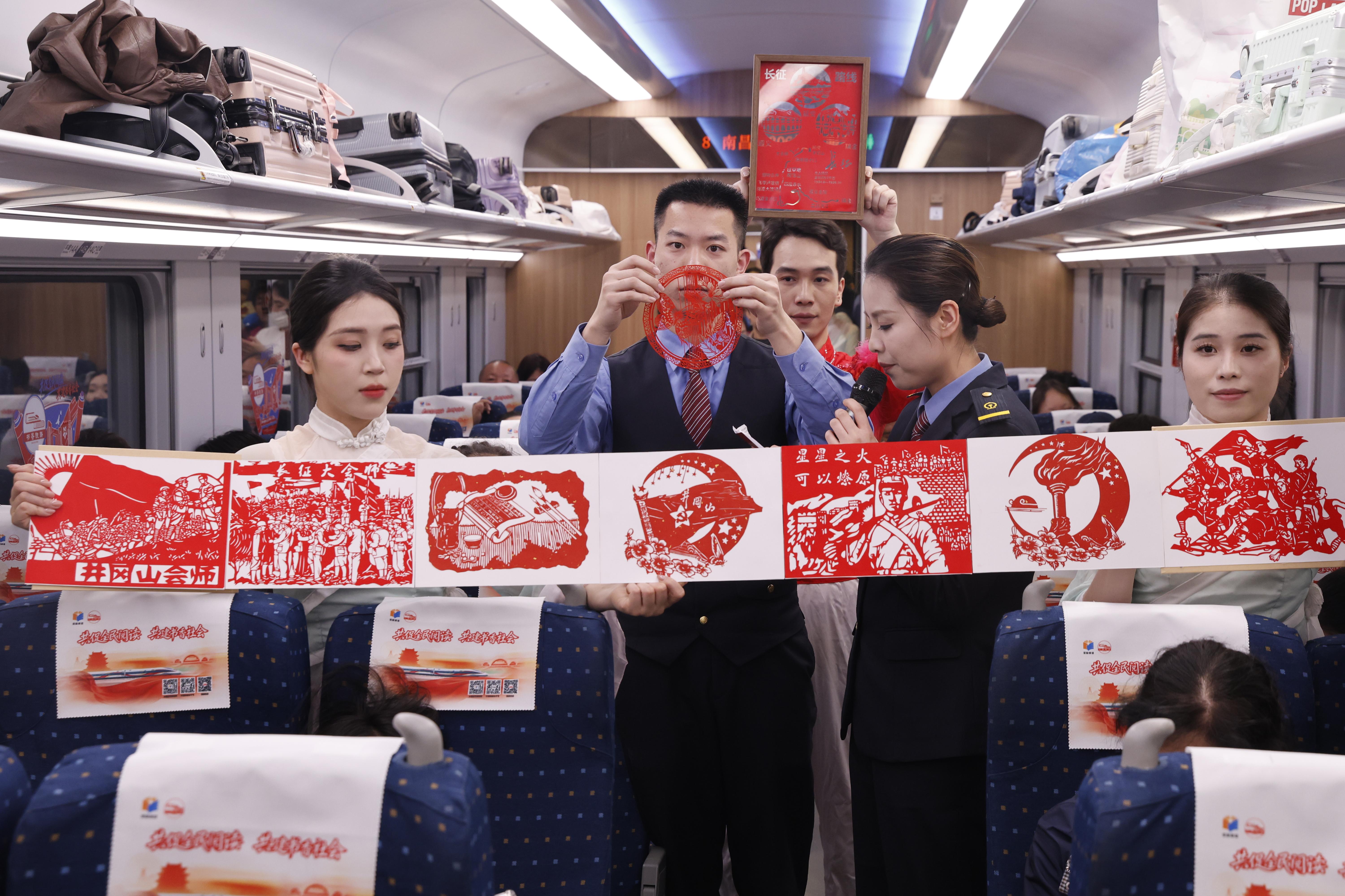 D133次书香列车上工作人员向旅客展示非遗剪纸作品。郝劲搏 摄