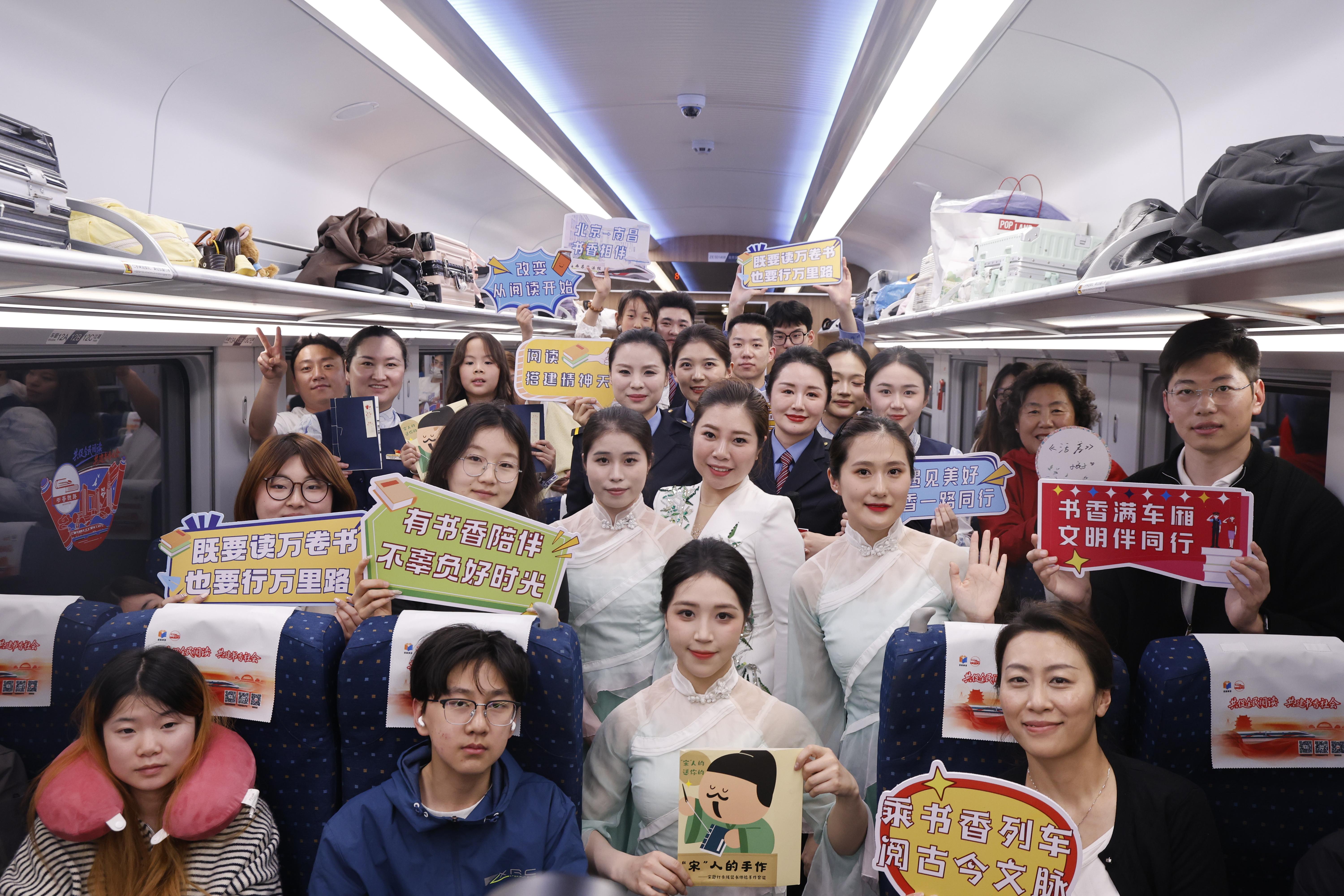 2026年4月19日18时13分,D133次“书香列车”从北京丰台站准点驶出。车厢内,诗词朗诵、飞花令等互动活动精彩纷呈,欢声笑语与阵阵掌声交织,满载着书香一路向北。与此同时,一座独具赣派书院风韵的“书香驿站”矗立在南昌西站候车厅,吸引着南来北往的旅客驻足,也迎接着“书香列车”上的旅客。一动一静、遥相呼应,为20日在江西南昌开幕的第五届全民阅读大会,铺展开浓郁的书香画卷。