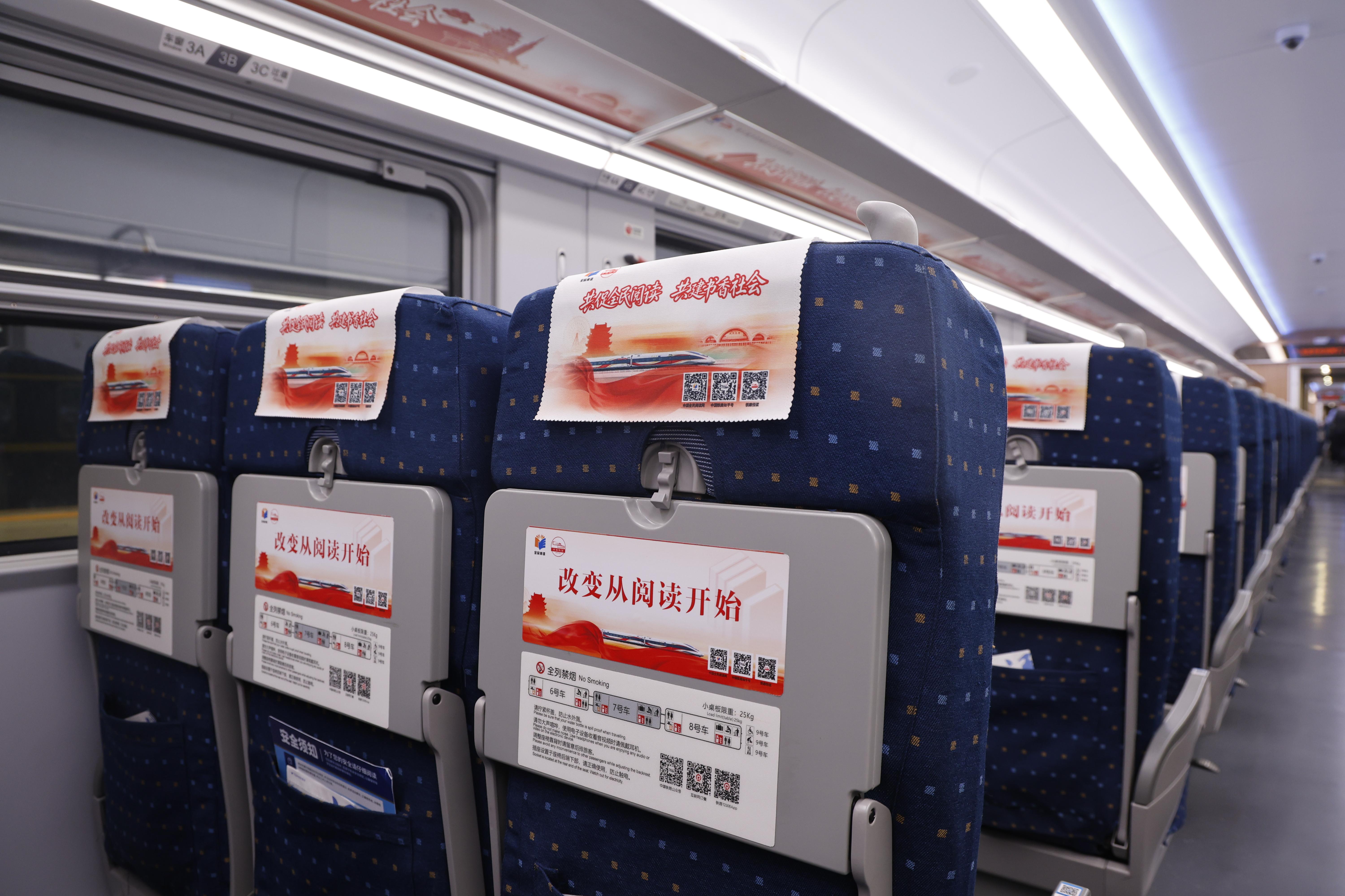 登上“书香列车”,处处洋溢着浓郁的阅读氛围:每节车厢车窗、座椅靠背、小桌板等醒目位置张贴全民阅读标识、海报、“铁路悦读”二维码;餐车吧台设置“读书角”,主题读物、经典名著、人文社科等各类图书整齐摆放,旅客可以自由借阅;“青年书店・青春书厢”流动小车穿梭于车厢过道,将好书送到旅客身边。第五届全民阅读大会期间,各趟书香列车上将开展“书香铁路・我喜爱的好书”读书分享活动,引导广大旅客坐着火车品书香。