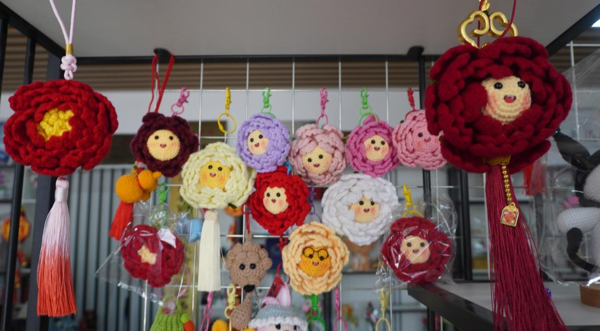 在“丹丹仔”众多产品中,钩织备受游客喜爱,它由鲁西南古法钩织技艺一针一线手工打造。这是辰禾文创与菏泽鲁西新区非遗技艺的一次深度联动。公司邀请鲁西南古法钩织技艺传承人张惠灵带领手工团队,用传统钩织工艺制作“丹丹仔”。