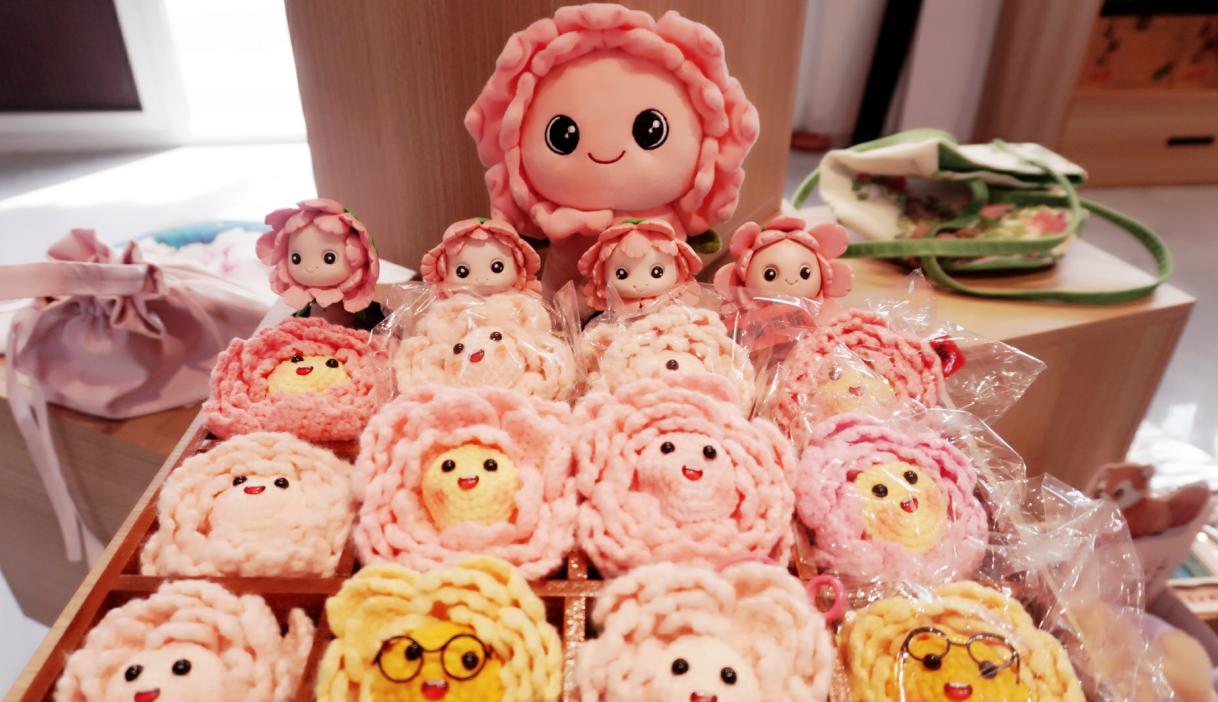 “技法是固定的,新作品要先构思出来再去制作。”张惠灵说。但将平面的设计图转化为立体的钩织公仔,并非易事。为了保留菏泽牡丹盛放柔美形态,同时贴合年轻审美,张惠灵和团队反复试验。针法松紧度的把控、花瓣弧度的呈现、Q版人偶比例的拿捏……每一个细节都在传统针法基础上反复打磨、不断调整。