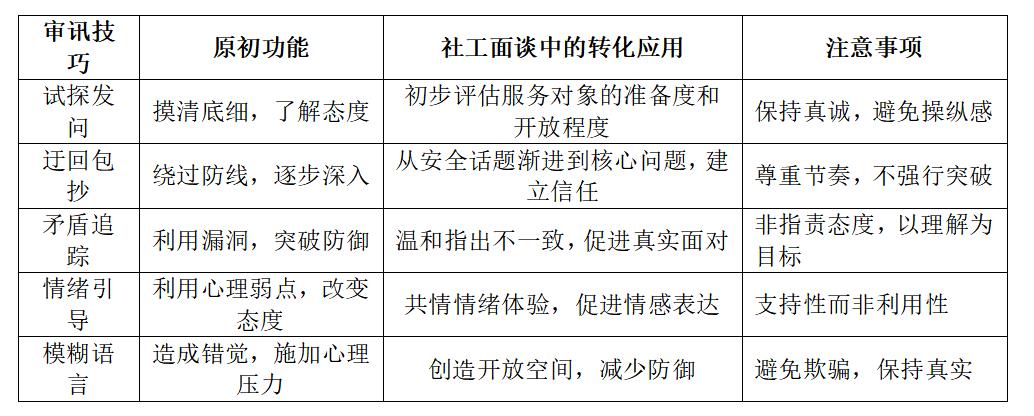 表2:审讯技巧在社工面谈中的转化应用