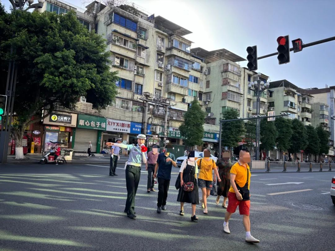 In a sustained effort to create a safe, civilized, orderly, and smooth road traffic environment—and to prevent and reduce accidents caused by unsafe and uncivilized behaviors like pedestrians jaywalking, running red lights, and climbing over guardrails—Leshan's public security traffic police have intensified efforts to correct and educate against pedestrian violations. Under the unified deployment of the Leshan Public Security Bureau Traffic Management Detachment, traffic police brigades in the main urban areas have adopted multiple measures to enforce safety, ensuring residents' travel safety.