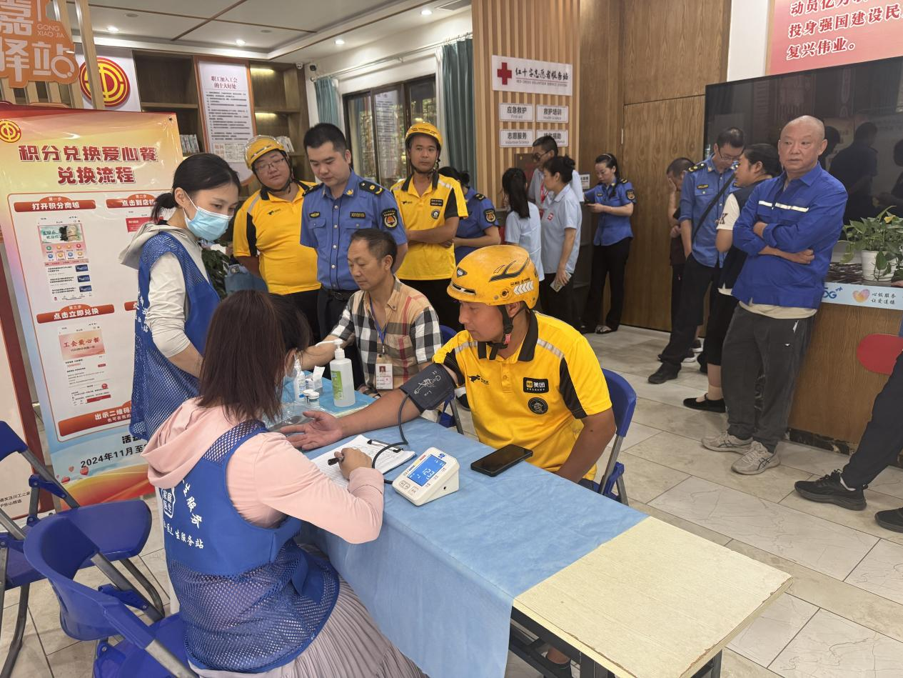 In the scorching summer heat, the unbearable swelter has become a daily reality. To safeguard the health of frontline outdoor workers battling extreme temperatures and convey the care of trade union organizations, on July 18th, the Green Heart Subdistrict Trade Union Association launched the "Summer Cooling Initiative: Trade Unions with You" event at the "Gongxiaojia" Warm Heart Station in southern Leshan. The initiative provided free medical checkups and health screenings for sanitation workers, food delivery riders, ride-hailing drivers, urban management personnel, residential security staff, and gas station workers within the district, while also distributing cooling supplies to support these outdoor laborers and emerging employment groups.