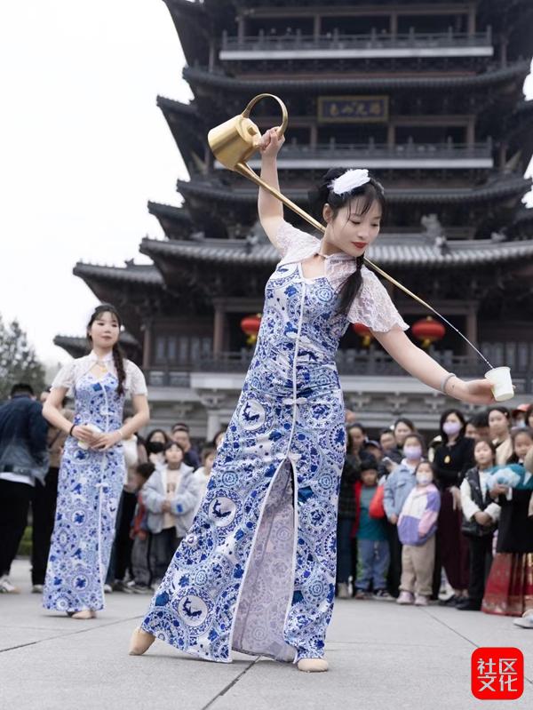 茶艺师执长嘴壶,此壶源于古时,造型独特,长嘴流细如注,壶身雕刻精美,尽显匠心独运。茶艺师挥洒自如,展花式茶艺,犹如游龙戏水,姿态翩若惊鸿,技艺非凡。糕点仿宋制而作,精巧玲珑,细腻如丝,入口即化,余味绵长,仿佛品味历史之甘醇。席间古风舞蹈如梦似幻,舞者身披华裳,翩翩起舞,宛若仙子下凡。观者仿佛穿越时空,与古人共舞,沉醉于汉唐之韵,感受古风之雅趣。