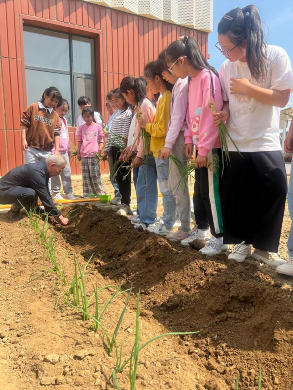 按照部署,分工劳作,有的刨垄,有的选葱苗,有的栽葱苗,有的浇水,最后用适量的土把根部覆盖上。队员们脚踏实地,动手体验了栽葱的全过程,学得有模有样,干得热火朝天。