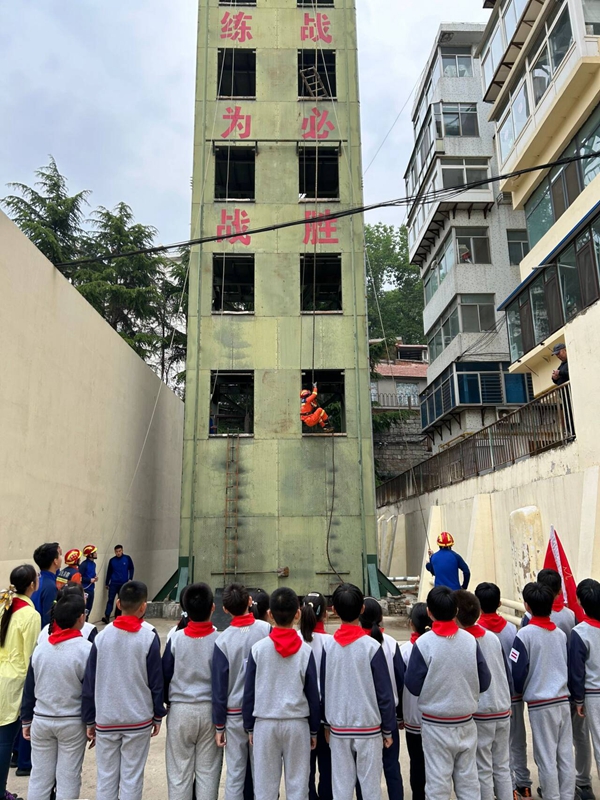 辅导员老师还带领队员走进芝罘区消防救援站,参观了战士们的日常训练:爬绳训练,拉梯操训练,快速着装,消防战士的内务。队员发表感言:训练场一半,火场一半,生一半,死一半这是消防员的风采!