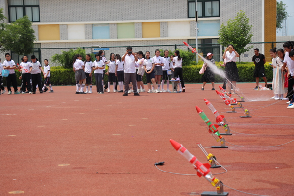 最终,我们看到一个个火箭腾空而起,并伴随着飞扬的水雾,在同学们童真的微笑和成功后的欢呼雀跃中结束了活动。