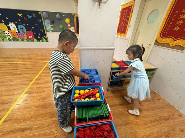 孩子们想出了各种办法整理,设计新的标签贴在盒子上进行分类,不同形状、不同材质、不同颜色,不同大小的玩具也分类进行整理。