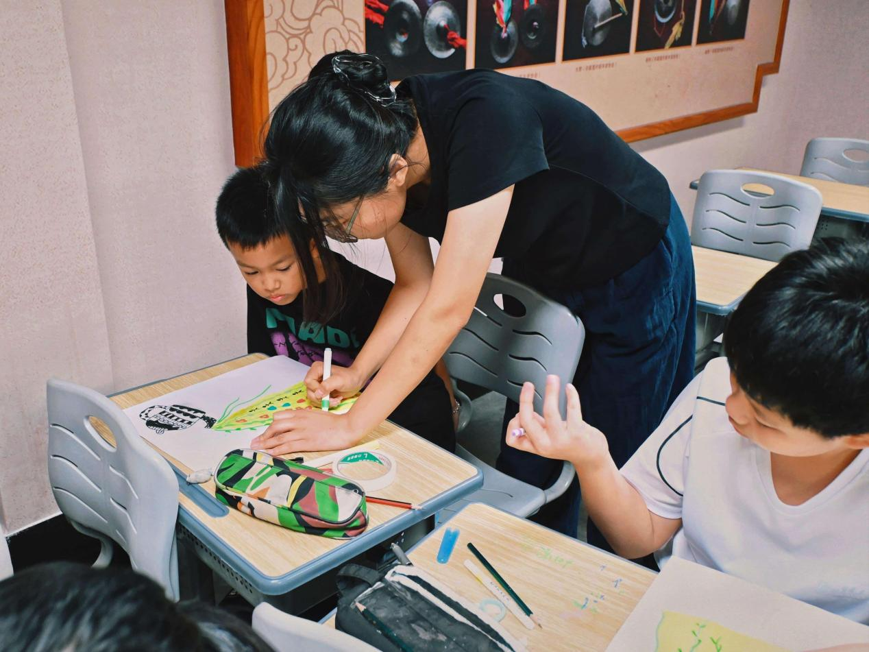 美术手工课上,茶学专业队员以“茶乡记忆”为切入点,引导孩子们将日常所见的茶器、茶田转化为绘画素材。“这壶春茶里,藏着爷爷炒茶的汗水,也藏着妈妈待客的热情”,队员的话语让孩子们对“一壶春茶”的创作有了更深理解。手把手的指导中,孩子们用稚嫩的画笔勾勒出茶壶的雅致、茶叶的舒展,每一笔都饱含对家乡茶文化的质朴热爱。专业知识在艺术转化中变得可知可感。