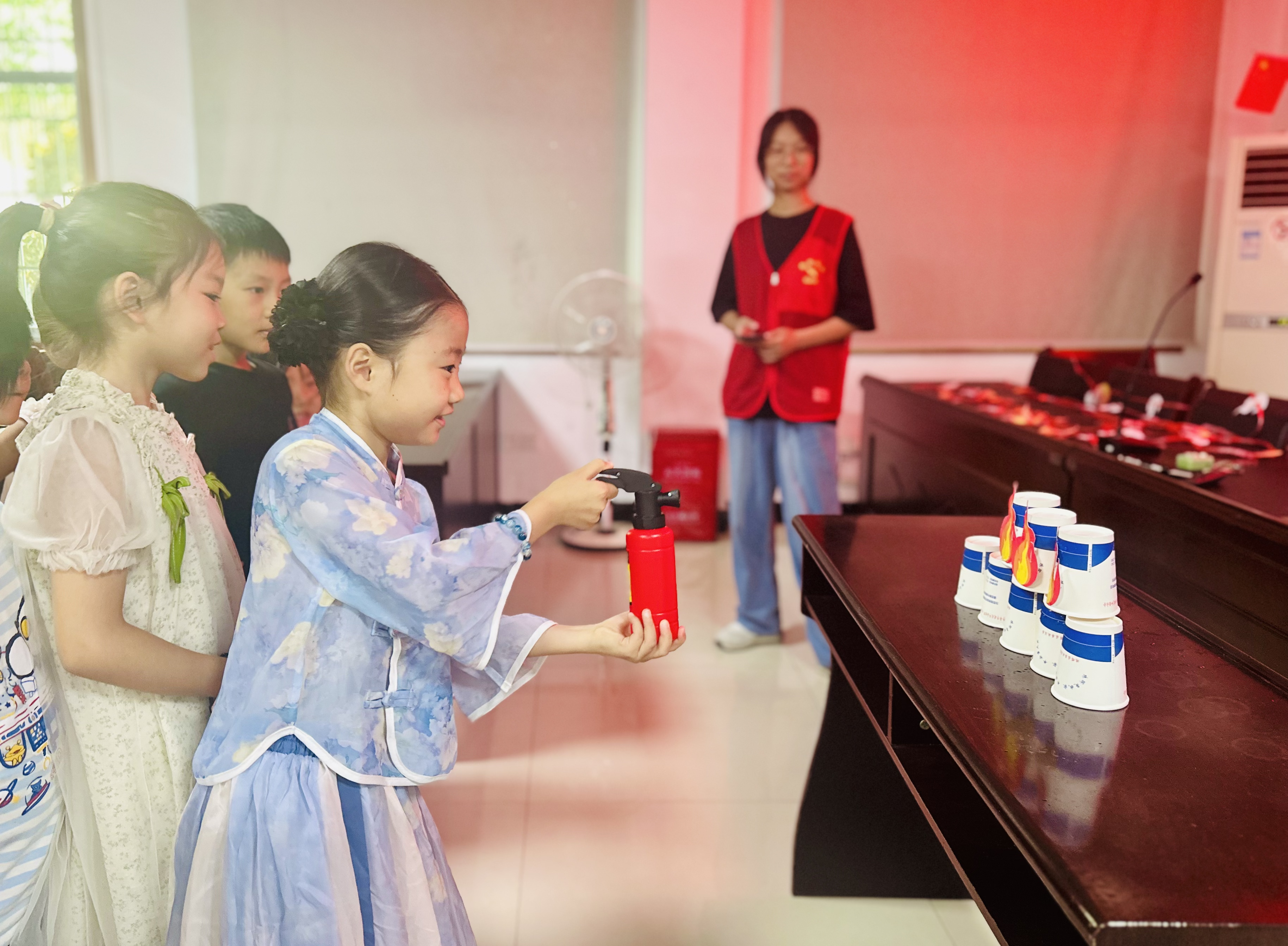 为增强孩子们的直观感受和实操能力,活动设置了情景模拟环节,生动展示了在溺水、火灾等紧急情况下应如何自救。宁燕还提醒大家高温天气注意用水用电安全,避免同一插座超负荷使用电器,并介绍了科学有效的防暑降温措施。随后的互动环节中,社区工作人员带领孩子们开展了“消防出击”和“穿越火线”两个小游戏,引导大家在实践体验中巩固所学知识,提升安全意识。