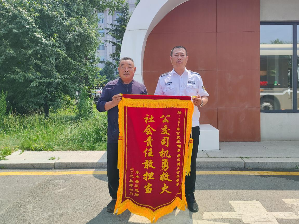 7月9日上午,东丰县市民王先生捧着一面印着 “公交司机勇救火 社会责任敢担当”的锦旗,郑重地送到103路驾驶员李志超手中,以此表达心中深深的感激。今年5月27日,王先生在长江路所驾驶的农用车突然起火,火势迅速蔓延,情况万分危急。此时李志超驾驶103路公交车经过,他当即安全停车,毫不犹豫的拿起随车灭火器冲上起火车辆进行扑救。火势得到控制并熄灭后,李志超没留下任何信息便返回工作岗位。王先生一心想当面道谢,只记得是103路公交驾驶员,经过多日寻找,终于在新起点公交站寻找到李志超。王先生紧握着李志超的手,激动的说道“当时真的是太危险了,多亏李师傅出手相助,不然损失可就大了”,感激之情溢于言表。这面锦旗,不仅是对李志超个人义举的肯定,更彰显了公交司机在危急时刻挺身而出的担当,为交通运输行业树立了践行社会责任的优秀榜样!