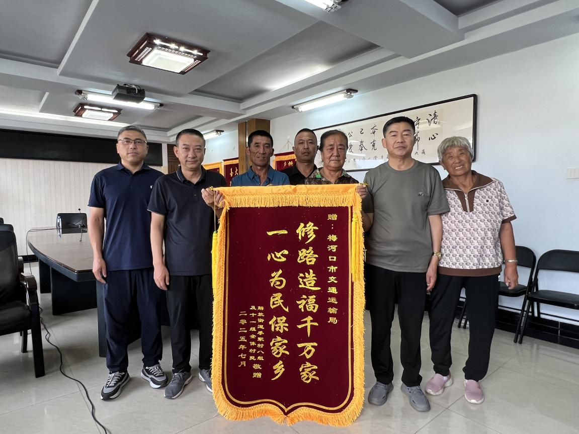 8月1日,梅河口市解放街道季家村委会为交通运输局送来绣着“修路造福千万家 一心为民保家乡”的锦旗。解放街道季家八组至季家十一组0.8公里农村公路修建于2004年,为水泥路面,破碎板严重,道路坑洼不平,给村民出行带来极大困扰。2025年,交通运输局将该路段列为新改建计划,新建沥青混凝土路面,于7月份建成使用。平整的路修在了驻地群众的心坎里,没有了往日的尘土,更没有了往日的泥泞,一声声由衷的赞叹,表达着发自内心的喜悦和感激。