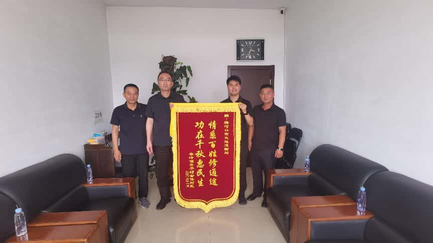 8月4日,梅河口市杏岭镇政府领导将一面绣着“情系百姓修通途 功在千秋惠民生”的锦旗送到交通运输局,表达感激之情。杏岭镇升平村村路为2024年通屯路建设项目,于今年6月末复工建设,原设计里程为1.6公里。经实地踏查,针对升平村偏远地段群众出行难的特殊情况,增加了250延长米建设里程。现升平村村路已全部完工,待养生期过后便可通车使用。路平整了,群众心也不堵了,主动为群众修缮道路,直接解决了人民群众最关心最直接最现实的利益问题。