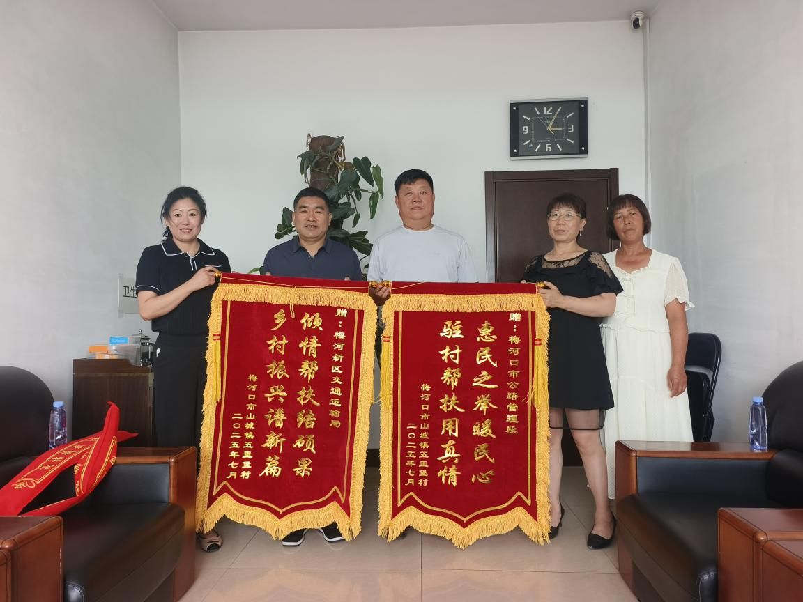 近日,山城镇五里堡村“两委”代表将一面绣有“倾情帮扶结硕果 乡村振兴谱新篇”和一面绣着“惠民之举暖民心 驻村帮扶用真情”的锦旗送到交通运输局和公路管理段,感谢市公路管理段在驻村帮扶、脱贫攻坚工作中的倾心付出。作为包保单位,市公路管理段始终把五里堡村的发展和村民的冷暖放在心上。驻村工作队扎根一线,从改善基础设施入手,协调资金修缮村内道路、加固饮水设施,解决了村民“出行难、用水愁”的痛点;同时结合村情实际,引进特色种植项目,帮助村民拓宽增收渠道。此外,工作队还常态化开展走访慰问,为困难家庭送去生活物资,用实打实的行动赢得了村民的信任,与五里堡村共同描绘出乡村振兴的新画卷。
