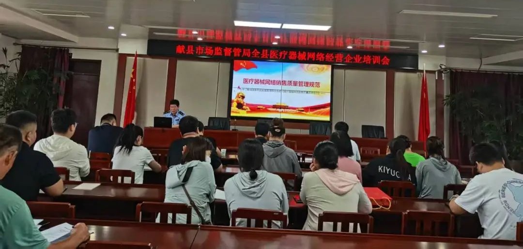 据悉,上述“管理规范“将于2025年10月1日正式施行,旨在规范医疗器械网络销售行为,保障公众用械安全。为深入宣传《规范》的重要意义,帮助相关人员全面理解和掌握《规范》实质内容,献县市场监督管理局精心组织了此次培训,网络销售监管人员、网络销售经营者及电商平台经营者共110人参加。