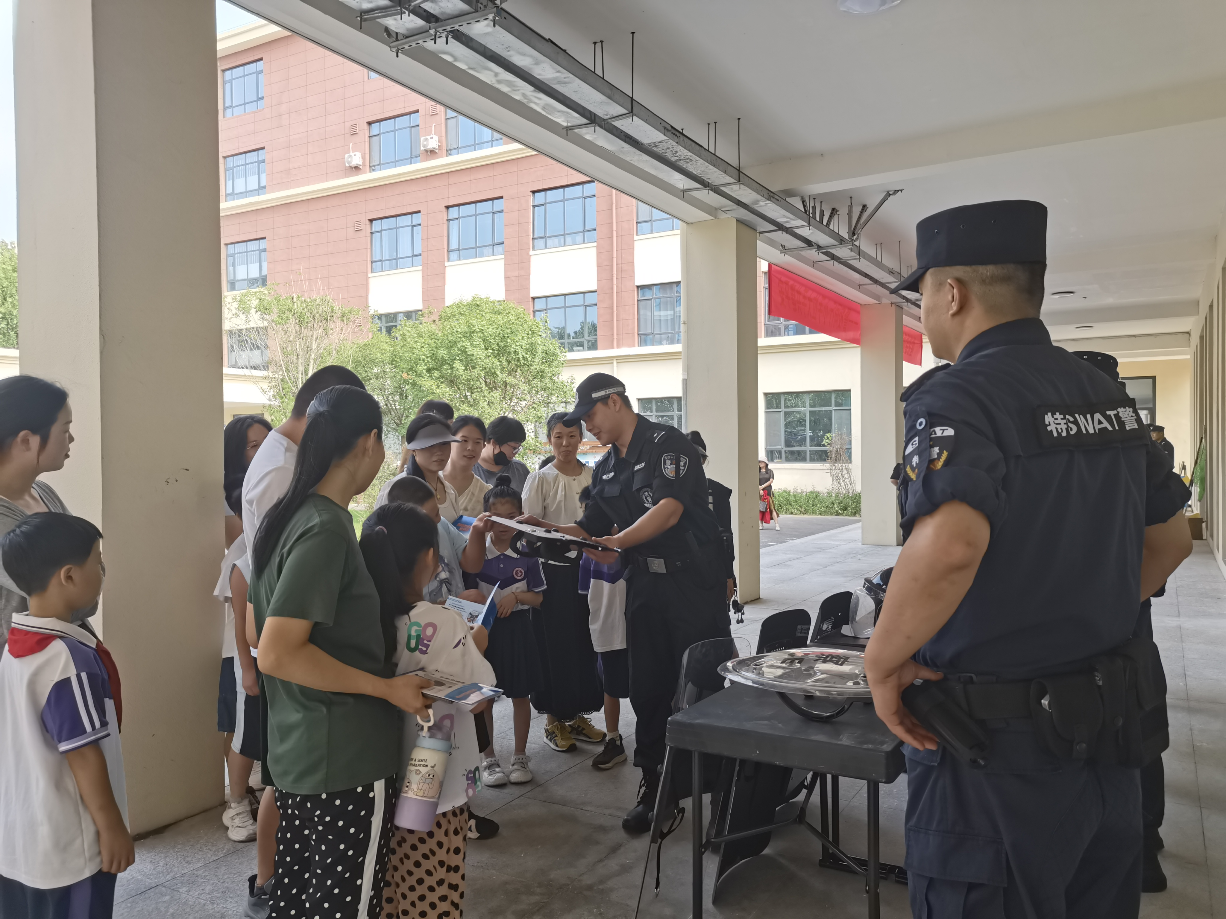 8月13日,隆尧县唐尧街小学操场上,公安特警正引导小朋友们参观各类警用装备和穿戴轻型装备,还让他们零距离体验警用头盔、防暴盾牌、执法记录仪等装备。当日,隆尧县社区建设服务中心联合该县教育局、公安局、唐尧社区开展了“警营探秘亲子行”研学活动。