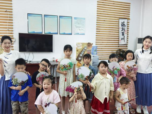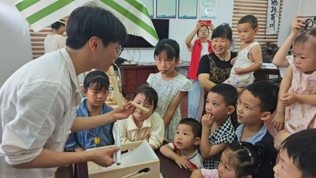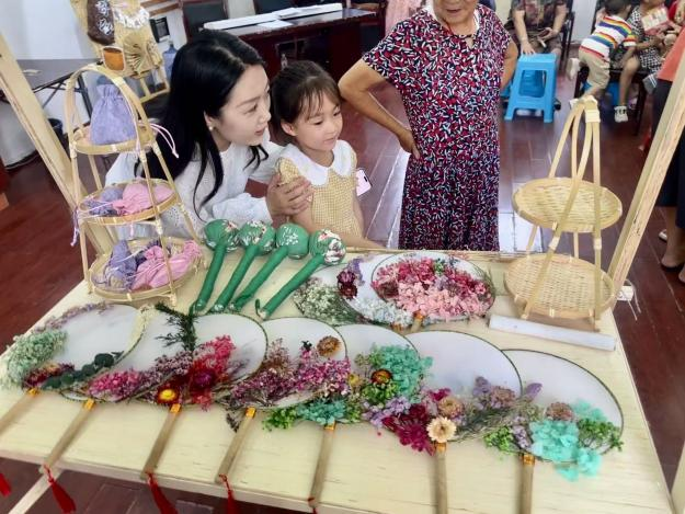 幼儿们拿起自己制作的中药扇子、驱蚊包、艾草锤、艾条等,向村民和自己的家人讲解中草药的功效:“夏天用这个扇子扇风,又凉快又好闻,还很漂亮”“驱蚊包可以赶走蚊子”“这个小锤子可以给我奶奶捶捶背”……