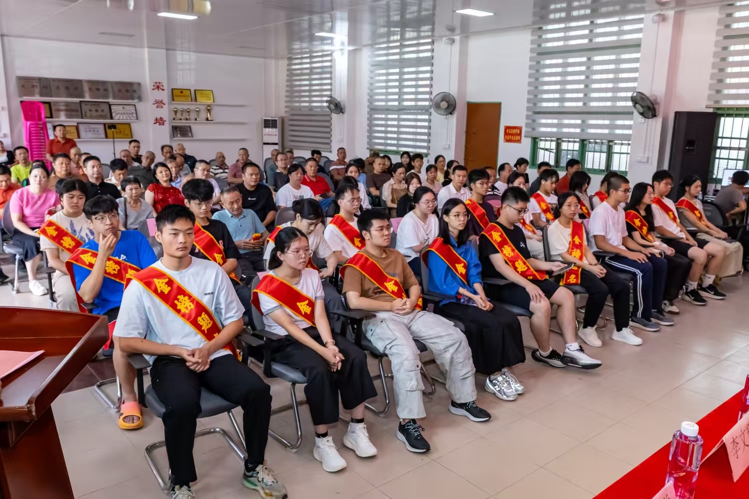 仪式现场,红旗村党委书记吕雅容向所有准大学生致以热烈祝贺,并寄语学子们要带着家乡的期盼勇敢奔赴更广阔的天地,以所学知识回馈社会、为家乡争光。随后进入颁奖环节,获奖学子按批次有序上台领取奖学金及证书,现场掌声雷动,闪光灯不停,将每一位学子的灿烂笑容定格成珍贵画面。