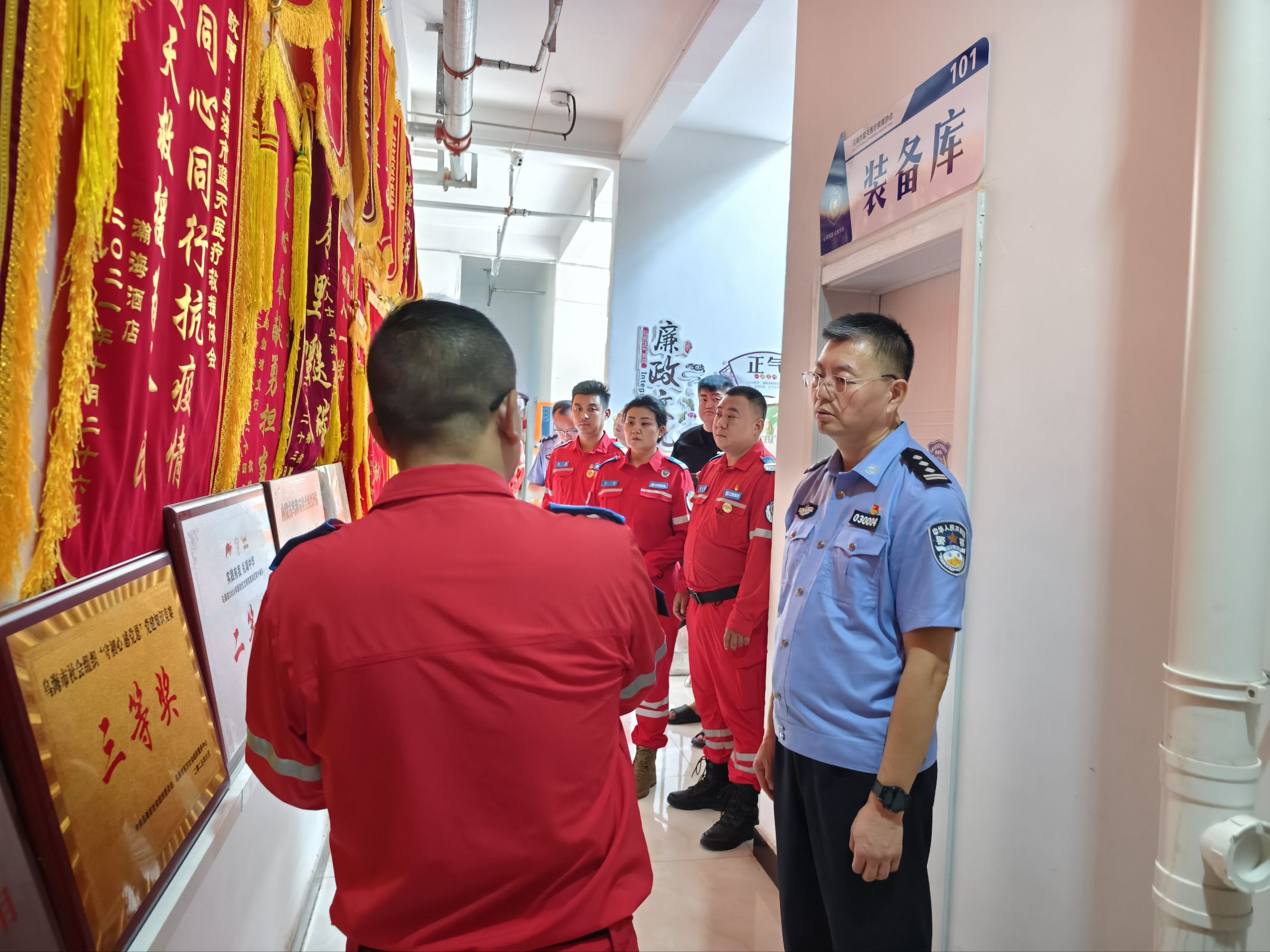 随后,领导一行移步至协会精心布置的宣传展板区。刘海军会长以展板为脉络,生动回顾了协会从创立之初的筚路蓝缕到如今初具规模的发展历程。他详细介绍了协会历年来参与的重大救援行动、获得的各项荣誉表彰、队伍建设的坚实足迹,以及“少说多做,默默奉献”的志愿精神传承。一幅幅图片、一行行文字,清晰勾勒出协会服务社会、守护生命的坚实步伐。公安领导们驻足聆听,对协会的专业能力、实战经验和社会贡献表示高度赞赏,认为其深厚的历史积淀是未来协同作战的宝贵财富。