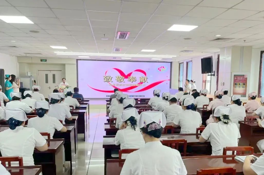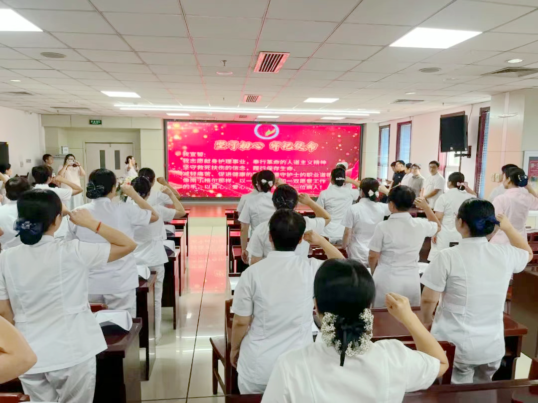 随后,在护理部主任王靖的带领下,全体护士右手紧握成拳,齐声重温南丁格尔誓言。“我宣誓:我志愿献身护理事业,奉行革命的人道主义精神……”字字千钧的誓言响彻会场,既是对护理初心的深情回望,更是对守护生命使命的庄严承诺。