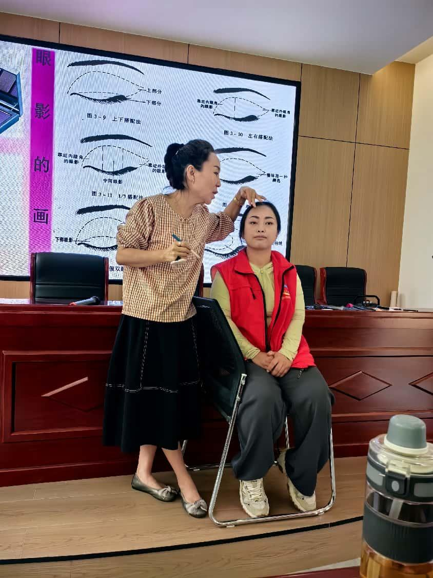 示范环节更似一场美的启蒙。老师执起彩妆工具,如艺术家雕琢作品般,将底妆的轻薄服帖、眼妆的层次晕染、唇妆的点睛之笔一一拆解示范,每一个动作都精准而温柔。妇女们的目光紧紧追随着,仿佛生怕错过一丝一毫的精彩,指尖早已跃跃欲试。实操时,大家你帮我调整眉峰的弧度,我为你指点腮红的落点,昔日里熟悉的邻里此刻成了共探美的伙伴,笑语与切磋声交织,空气中弥漫着成就感的甜香。