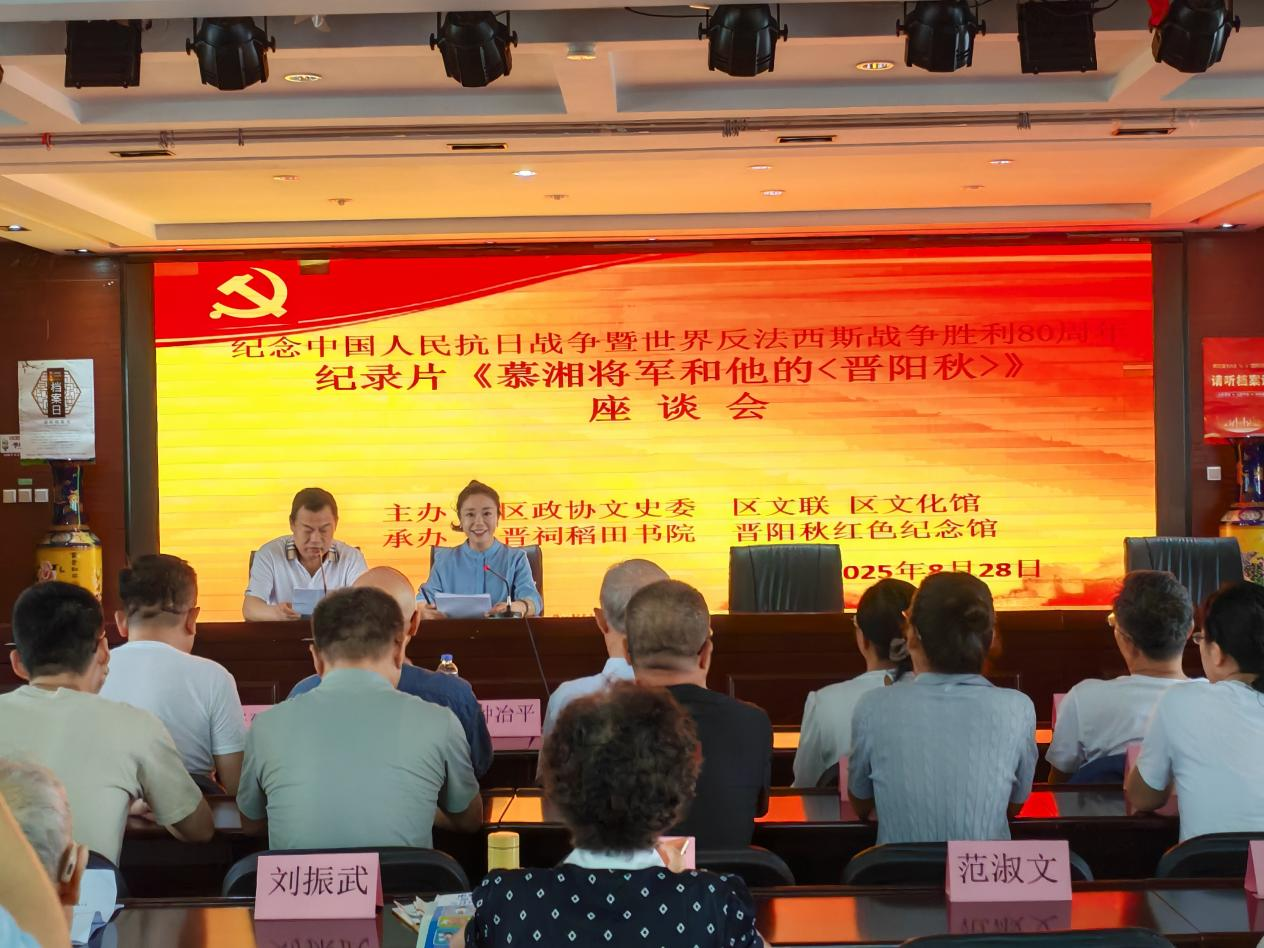 社区文化网讯(程义 报道 通讯员 杨润德 王惠林)今年是纪念中国人民抗日战争暨世界反法西斯战争胜利80周年,8月28日上午,纪录片《慕湘将军和他的晋阳秋》座谈会在晋源区文旅局三楼会议室举行。来自省市区党史研究、文艺创作、文化传播等领域的专家学者及相关单位代表齐聚一堂,围绕慕湘将军的革命精神、《晋阳秋》的历史价值与时代意义展开深入研讨,共同探寻红色文化的传承路径。